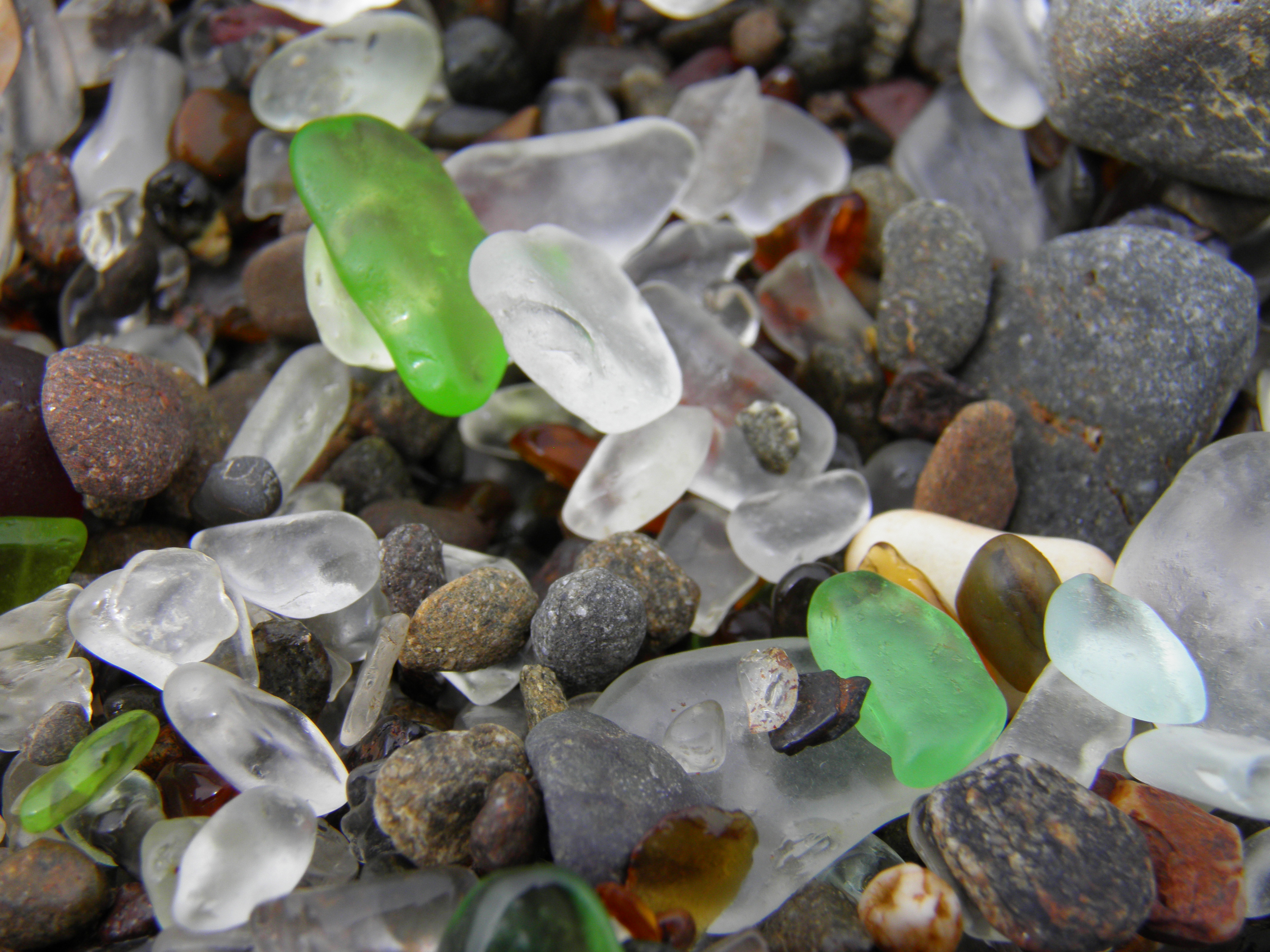 But more than anything else, there is glass: greens, browns, clear and cloudy whites, an occasional glimpse of blue, and more rarely, red. When a wave spills itself onto the shore, the rocky cove is transformed into a treasure trove. It’s a romantic image. Glass glints like gems in the sun when the wave recedes; jewels strewn about like common rocks, as if a pirate’s chest had burst just as it washed ashore and spilled out emeralds and ambers, diamonds, sapphires, and rubies.